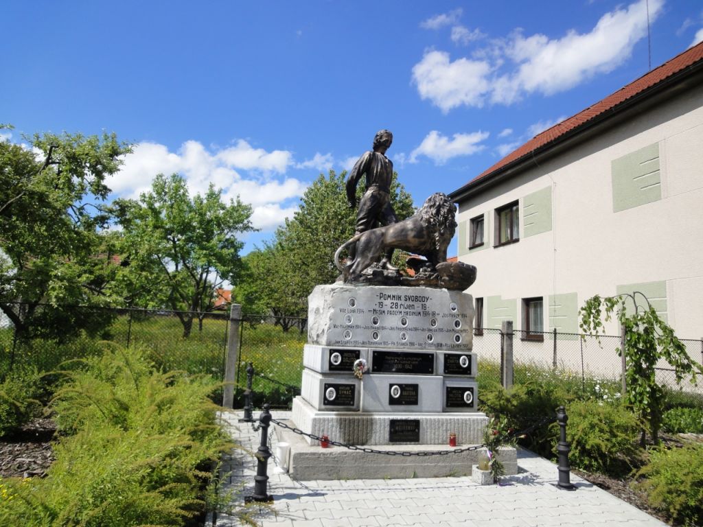 Pomník stával ve středu návsi pod lípami. V 70. letech při úpravě centra obce byl přesunut na okraj návsi. Tento pomník odráží tři velmi významné historické mezníky. Jedná se o Pomník svobody připomínající vznik Československé republiky 28. října 1918, Pomník padlým hrdinům v I. světové válce a Pomník umučených a popravených v období II. světové války. Na tomto pomníku jsou zachycena jména a podobizny těch, kteří hrdinsky zahynuli v letech 1914 -1918 a pak v letech 1939 - 1945. Sousoší Vojín a lev bylo natolik ve špatném stavu, že bylo nutné vytvořit jeho repliku.